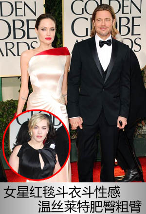 今年金球还有一个特点,众多大牌明星都带着另一半来走红毯。安吉丽娜朱莉与布拉德皮特这一对黄金伴侣赚尽了眼球。安吉丽娜红唇配白色礼服,高雅脱俗。邓文迪与丈夫默多克也来"凑热闹",不过,一向的时尚icon这次的时尚品味可不那么值得恭维了,流苏的包身长裙,让她看起来像中国舞狮队里的那头狮子。妮可基德曼与丈夫恩爱出席,妮可一身Versace 的修身长裙,很优雅。