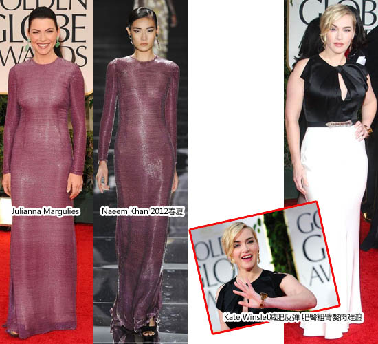 红毯上有美的,必然也会有穿着失误的。减肥失败的温丝莱特重新回到了"rose的年代",虽说也不到胖得惊悚的地步,但这位昔日的双料影后偏偏选择了一件无袖裹身的礼服,肥臀粗臂一览无遗,真是一大失误。Julianna Margulies算是这次红毯上包裹得最严实的一位了,从头到脚,裹得像粽子一样。虽说在红毯上想要寻求突破,这样的尝试也未尝不可,但如果没有瘦码的身材,真的请千万别穿紧身裙。