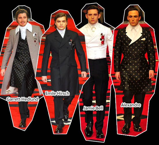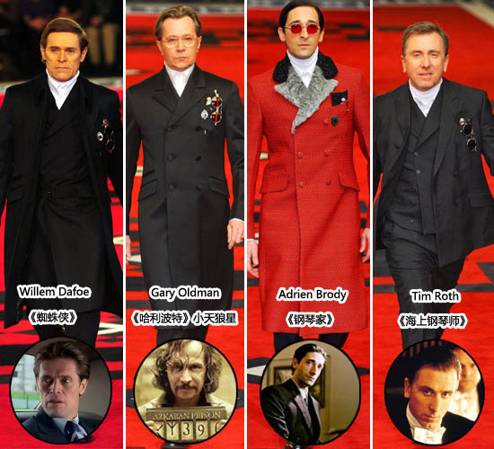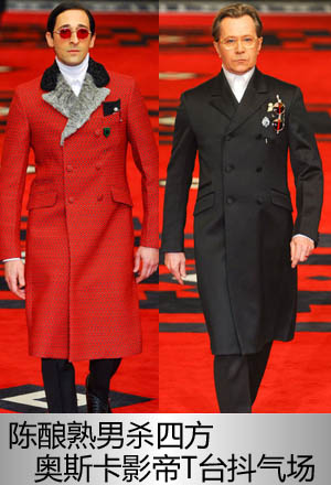 事实证明,今年的米兰秋冬男装周上最大的惊喜绝对非PRADA莫属。与金球奖同一天举行的 prada2012秋冬男装发布会,不但没有被金球奖抢去风头,设计师Miuccia还把发布会搞成了一场星光熠熠的明星派对。在长约35米红白黑相间的伸展台上,表演的明星包括英国著名"才子"加里·奥德曼、实力演员蒂姆·罗斯、奥斯卡影帝艾德里安·布洛迪以及曾出演过《反基督者》的威廉·达福和"80后"影星杰米·贝尔等众多超强卡司演员轮番上阵。这些大咖男星们应该大多收到了金球奖的邀请,但他们不爱奖杯爱时装,在时装周上为我们精彩演出。