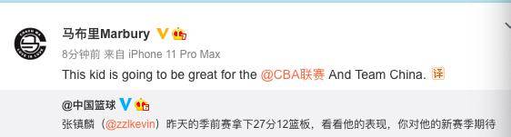 "这个孩子将会成为CBA和中国男篮的伟大球员。"马布里在自己的微博中写道。