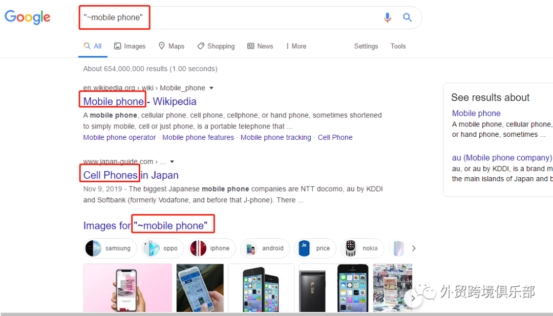 登陆www.google.com/ncr,在输入框输入"~" 即可查找某近义词又或某公司的CEO/purchasing manager等部门职位的客户。如下图以"~mobile phone"为例,搜索结果中包含了我们查询的短语以及该短语的同义词。