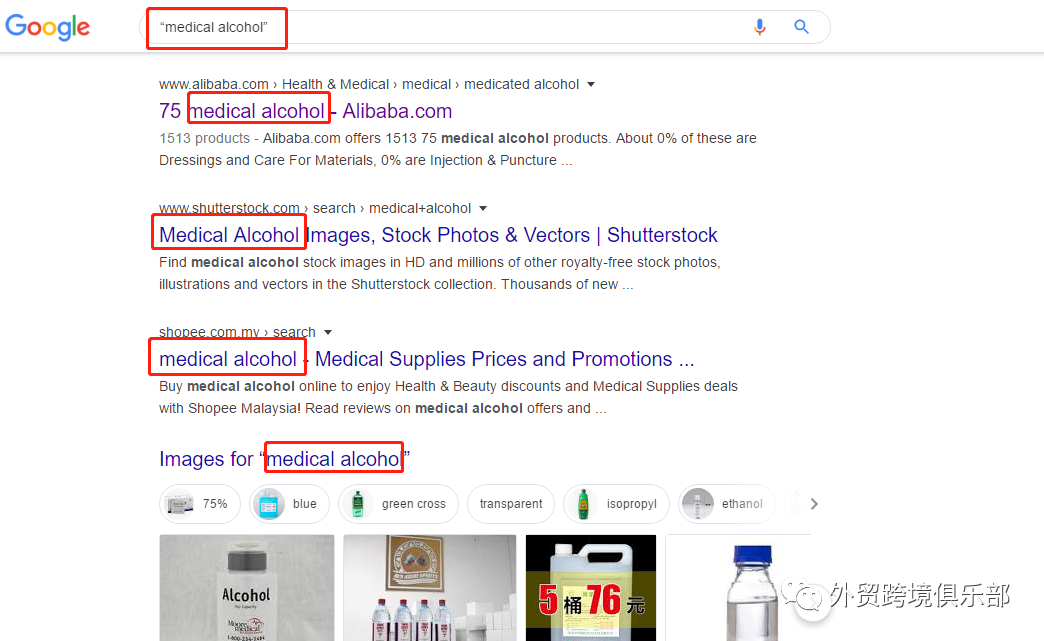 登陆网站www.google.com/ncr,在搜索框输入命令双引号 —— " " ," "是完全匹配的意思。通过命令" " 我们可以搜索确切的的字词或词组。如下图在输入框输入关键词"medical alcohol"即可搜索到各种卖医用酒精的客户。(关键词可以是任何语种)