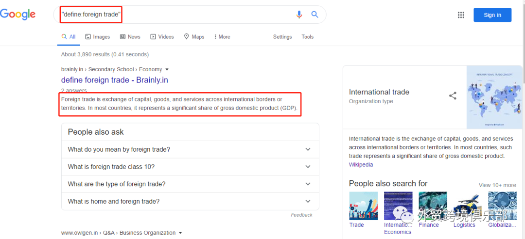 登陆www.google.com/ncr,在输入框"define:"即可查看专业名词的解释。如下图在输入框输入"foreign trade"即可查看外贸这一词的解释。