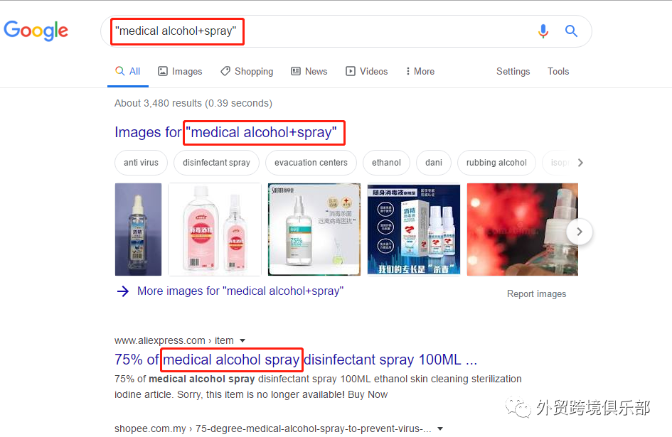 登陆网站www.google.com/ncr,在输入框输入"+"号,此命令是指要满足前后两个关键词。如下图在搜索框输入"medical alcohol+spray"即可找到卖医用酒精喷雾的商家。