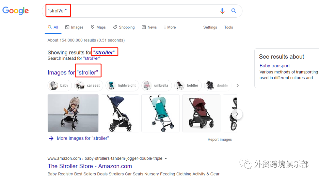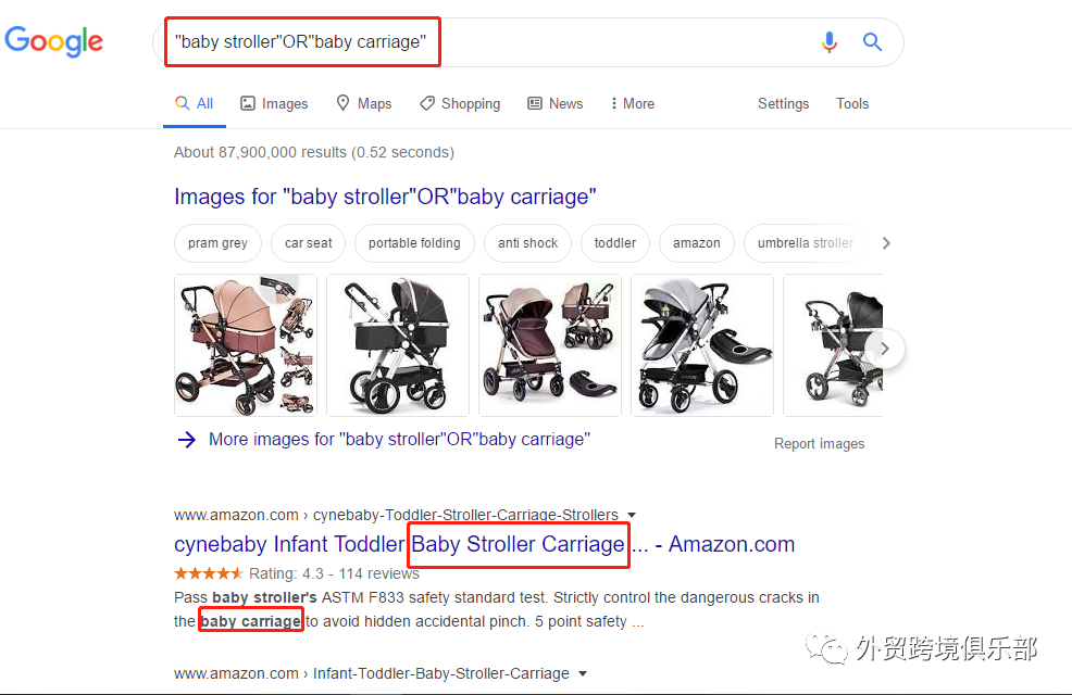 登陆www.google.com/ncr,在输入框输入"OR" ,其搜索结果至少包含了多个关键词中任一词。如下图在输入框输入"baby stroller OR baby carriage"即可查找到卖童车的客户。这里需要强调的是:OR必须大写,且前后需空格。