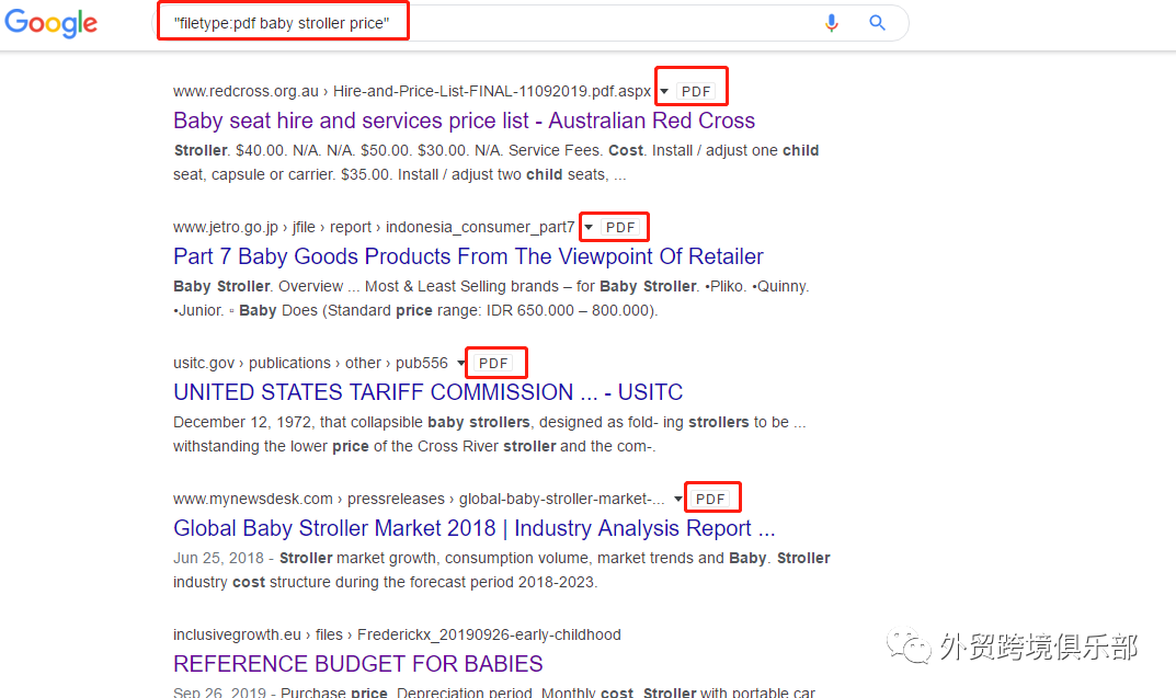 登陆www.google.com/ncr,在输入框输入"filetype:"(指定文件格式)即可搜集产品目录、报价、内部文件等。如下图在输入框输入"filetype:pdf baby stroller price"即可查找到童车的报价。