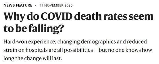 全世界范围内,新冠病毒造成的疾病(COVID-19)已经累计感染超过5000万人,造成120万人死亡。一个坏消息是,目前席卷全球的新冠病毒株在多方面显示出,传播性比最初出现时更强;一个好消息是,在世界各地,很多医疗机构观察到,COVID-19的病死率不断下降,进入重症监护病房(ICU)的新冠患者,现在有更高的机会存活下来。