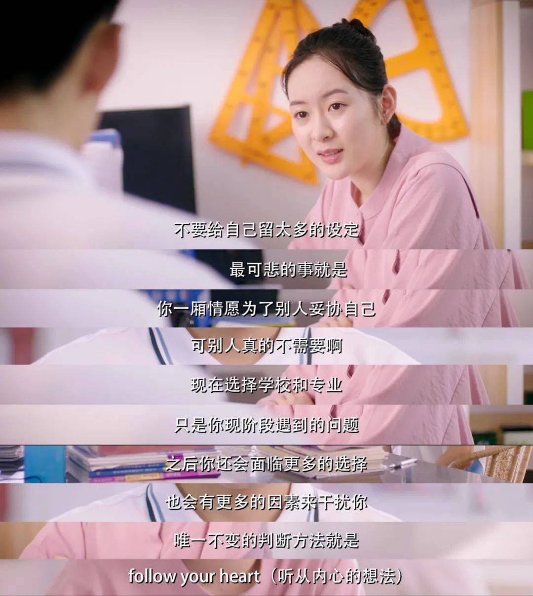 高中生活当然也少不了紧张的课业和考试,《教室的那一间》在高二文理分班时开始,高考前结束。这两次选择无疑都是高中生活,甚至是人生中较为重要的时刻,而这些经历几乎能引起每个90后的共鸣。剧中的每个人都用自己的方式为自己的未来负责。陈末和姚从良在发现自己特长的路上不断试错,不断成长。小雨也通过自己的努力,成绩有了明显的提高。学霸苏舟也在夏老师的建议下,决定听从内心的选择……虽然他们都不是完美的小孩,却以普通人的视角,努力的成长成自己喜欢的样子。