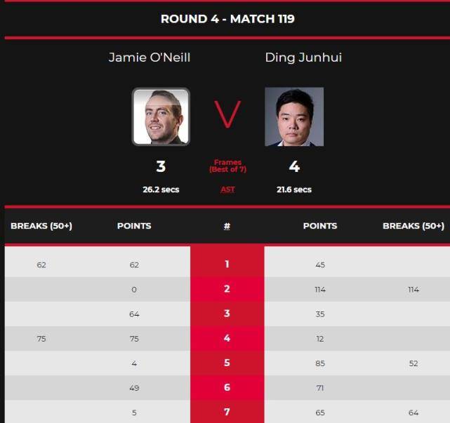 第四局,奥尼尔持续发力,打出单杆满分75分,75-12再胜一局,比分优势扩大到3-1,并赢得赛点。丁俊晖没有退路,必须绝地反击。第五局,丁俊晖单杆52分制胜,85-4挽救第一个赛点。第六局,丁俊晖又以71-49挽救第二个赛点,比分追成3-3。