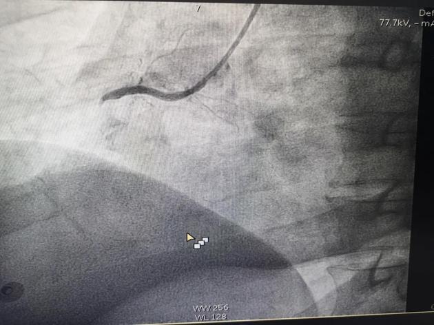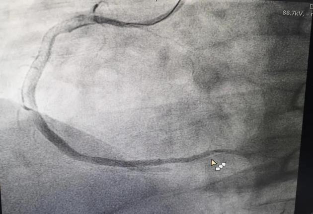 M老师在昏迷中,在各种仪器设备的强力生命支持条件下,由心血管介入团队对其完成了急诊冠脉造影检查——心脏右侧冠状动脉完全堵塞,伴有大量血栓形成!这是急性心肌梗死,需要马上手术开通血管。
