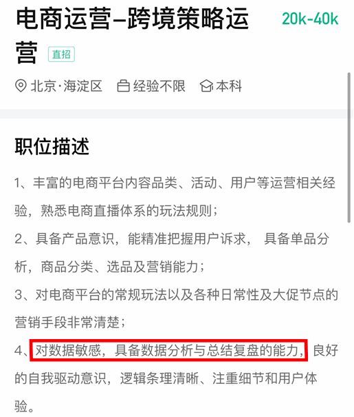 不管是做天猫运营、淘宝运营、京东运营还是跨境电商运营等,数据分析基本上已经成了企业招聘运营的标配: