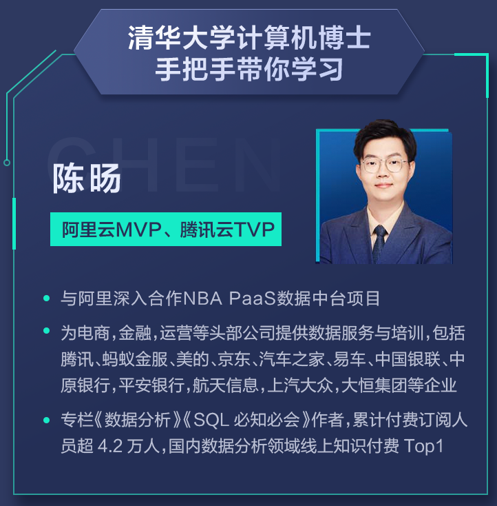 由清华大学计算机博士,阿里云MVP,腾讯云TVP——陈旸老师亲自授课,让你快速提升数据能力,让你离职场进阶、高薪收入更近一步。