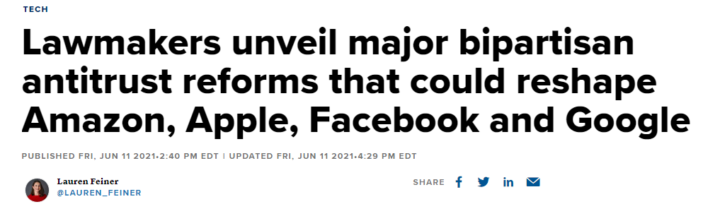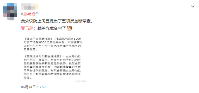 当地时间6月11日,美国国会众议院公布了五项草案,主要目的是反垄断改革,重塑美国科技巨头商业规范,剑指亚马逊、苹果、脸书、谷歌四大巨头,瞬间陷入"过街老鼠人人喊打"深渊泥潭。据了解,虽然五项草案在众议院得到了支持,但是想要在参议院通过还是困难重重,同样有很多参议院议员都对改变拥有上百年历史的反垄断法持怀疑态度。(图源CNBC)那么五项草案究竟说了什么,概述如下:《终止平台垄断法案》规定每月至少有5