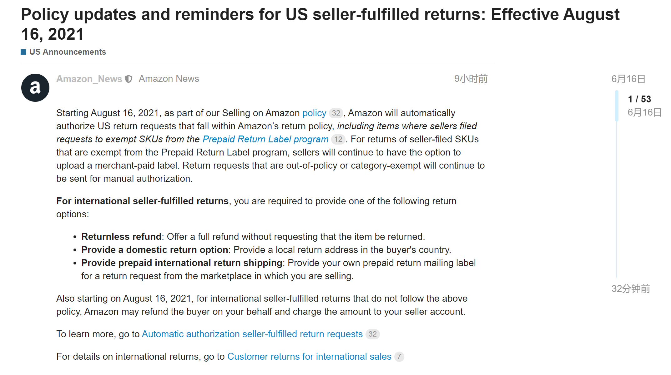 AMZ123获悉,亚马逊美国站发布公告称将更新美国自配送卖家退货政策,从8月16日开始,亚马逊将自动授权符合亚马逊退货政策范围内的美国退货请求。以下是公告内容: