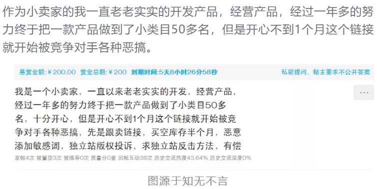 近期星球里有人问我被竞争对手买完库存怎么办?当时我第一反映这不是几年前恶搞的套路吗?直到我逛知无不言时看到下面这篇热帖,发现事情不是我想得那么简单。现在恶搞手段很多,不管大麦还是小麦都深受其害。先是跟卖链接,买空库存半个月。竞争对手发邮件给我让我停售产品,否则就继续恶搞我其他的产品,买空其他售卖得好的链接。一开始以为只是口头威胁,没成想之后店铺其他卖得好的产品真的被买空。发邮件告知对方我们可以降低