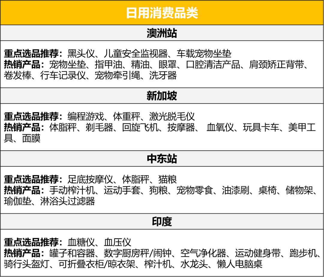除了以上新站点四大品类的综合榜单,小编也针对各个站点的重点选品推荐为大家带来更细致需求,致力从细节打动买家~