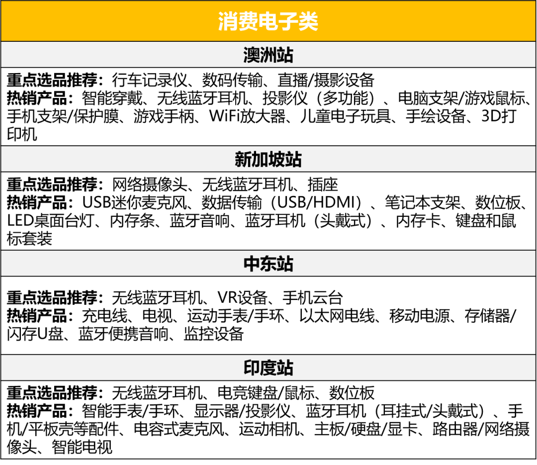 面对新站点四大品类:消费电子、时尚及服饰、百货、日用消费品的潜力市场,却不知从哪些选品精准出击?不用担心!小编已贴心地为大家准备了各个品类下澳洲、新加坡、中东及印度站的重点选品推荐及热销爆款清单!速速领取,抢占先机get2022新站点财富密码~