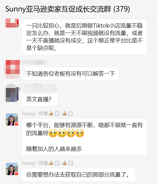 今天主要想简单记录下,群内抛出的问题,以及我的一些思考,那么究竟沈阳的平台可以一直有稳定的流量呢?群内本来的记录,如下图有个卖家一直想做Tiktok,但是担心不发视频、不做直播,Tiktok小店就没有稳定的流量了。其实随着平台的发展,肯定是希望平台能够有一定的活跃度,活跃度就意味着需要持续的产生新的内容,新的视频内容也好,新的直播,这些操作都能激活平台的用户,都能给目前现有平台的用户带来新的体验,