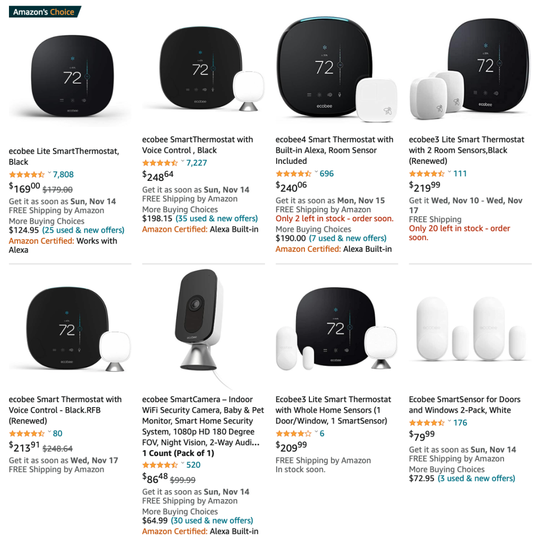 亚马逊是ecobee的主要销售渠道之一,其主打产品,适配alexa的智能恒温器,已经累计获得了数千个评论。在智能监控产品这个竞争相对激烈的类目中,ecobee也不落下风。