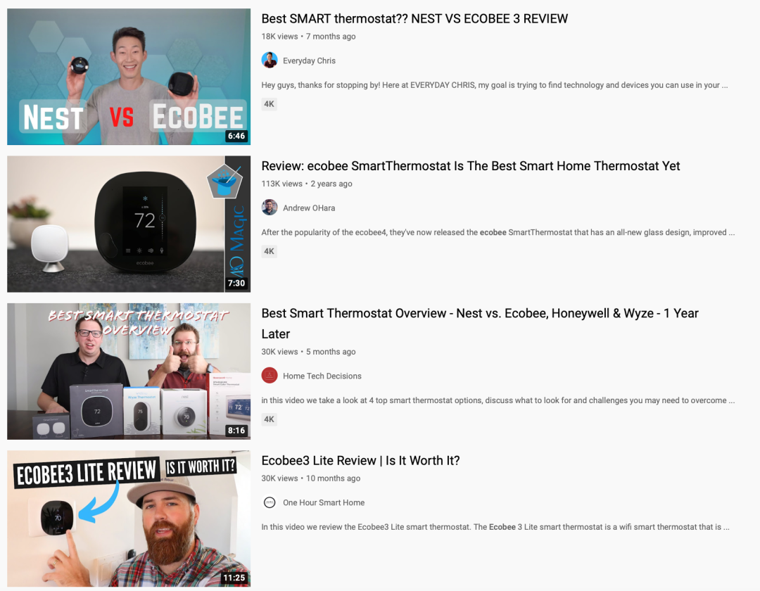 除了出众的产品力,ecobee自身的品牌打造也十分成功,它在年轻的科技消费人群中有良好的知名度。在油管上,有相当多用户发布的ecobee产品测评视频。