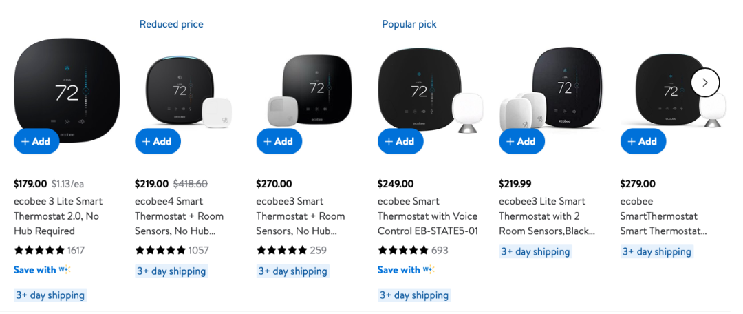 在沃尔玛,ecobee采用了价格错位的策略,和亚马逊产品命名和价格都稍有区分。普通消费者要仔细对比,才能找到哪个平台价格更优惠了。
