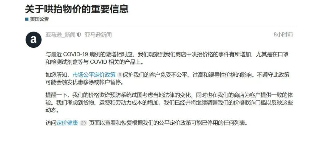 为了应对这一乱像,亚马逊官方出台了新的政策。明确表示违反市场公平定价政策规定的不公平、过高和误导性价格可能会导致卖家账户被暂停。