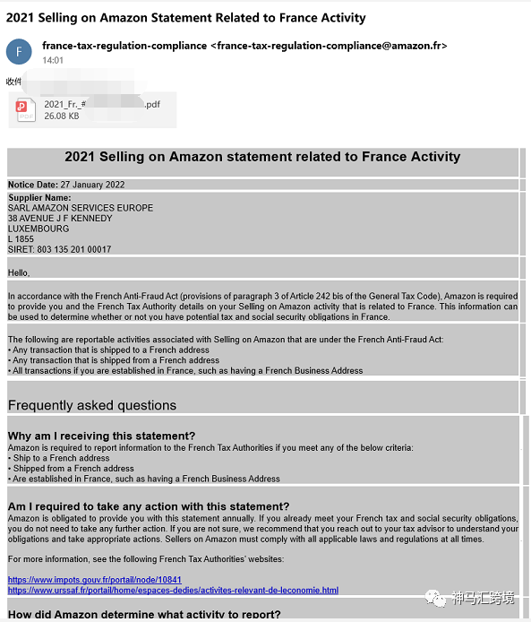 最近有很多欧洲站卖家收到一封主题为:2021 Selling on Amazon Statement Ralated to France Acticity的邮件,发件人是france-tax-regulation-compliance@amazon.fr,以下为邮件内容截图: