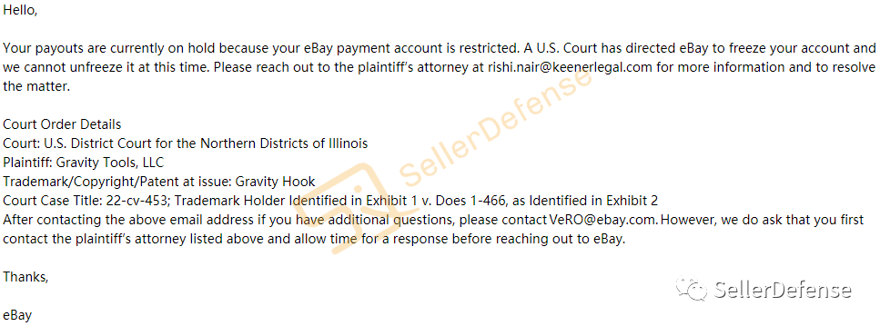 今天收到eBay卖家的邮件反馈,店铺因为Gravity Hook这款重力抓钩工具被冻结。经过我们排查后发现该案件有466个店铺被告,目前案件名单还未公布,后续名单曝出会持续更新。