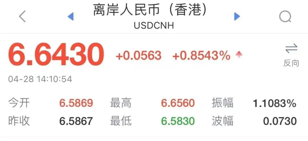 4月28日人民币突然大跌。人民币对美元即期汇率盘中接连跌破6.58、6.59、6.60、6.61和6.62关口。截止发稿,离岸人民币对美元汇率报6.6430,较上一个交易日收盘价6.5867,大幅贬值563个基点;最高报6.6560。