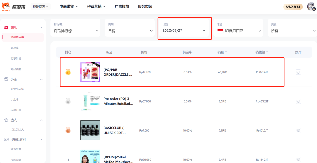 DAZZLE ME是嘀嗒狗印尼小店7.27日榜排名的第一的彩妆品牌,单日销量为43.2RB(千),单日销售额达到了861.4JT(百万)。