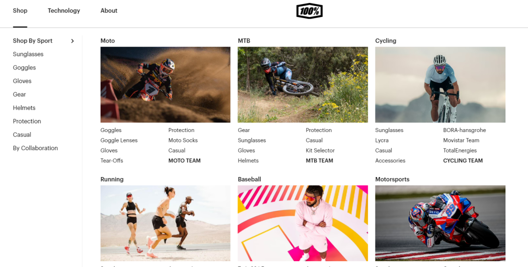 100%品牌最早可以追溯到1982年,当时它作为多个多个越野摩托车赛车队和赛车手的赞助商而开始名声鹊起,后于2010年被Saule,LLC收购,专门为越野摩托车、自行车、雪地摩托和其他赛车活动提供优质的运动装备。