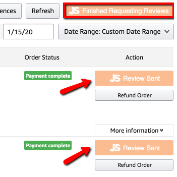 使用批量索评的方法也非常简单,打开亚马逊订单后台与JS插件,就可以看到一个橙色按钮"Request Review",索评完成后,按钮会变成"Request Sent", 即代表已经索评邮件已发送。