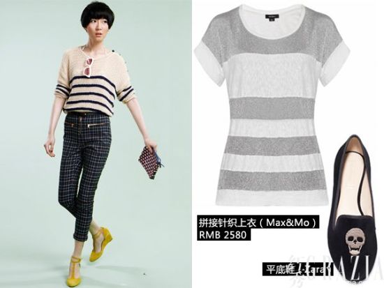 左图搭配:镂空条纹毛衣(System)RMB2,750、白色印花胸衣(H&M)RMB149、深蓝格子长裤(Max&Co。)RMB2,680、白色眼镜(Celine)、编织手包(DKNY)RMB5,190、黄色坡跟鞋(JC collezione)