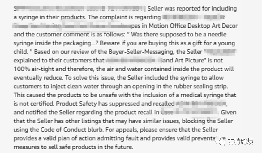 通过分析我们发现,这位卖家朋友销售的产品是沙画,为了能让卖家在沙画里注入水,使沙画保持美观,所以卖家在产品中添加了针管。由于商品中携带了针管,消费者在收到之后像亚马逊投诉,被以亚马逊判定为危险品。