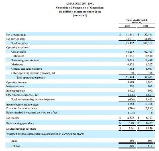 4月30日,亚马逊发布了2021年第一季度的财务业绩。在报告期内,营收1085.18亿美元,同比增长44%;净利润为81.07亿美元,较上年同比增长220%,并带来了1085亿美元的净销售额。