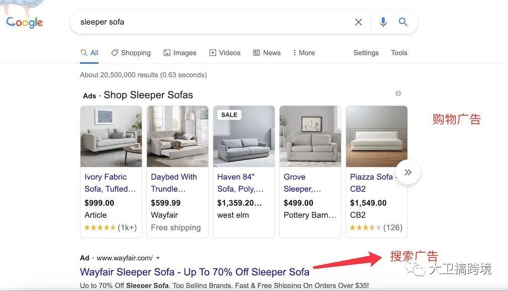 如下图所示,当我搜索sleeper sofa这个产品的时候,最上面的就是谷歌购物广告,下方的是搜索文字广告,购物广告排在搜索广告上面,由此可见如果你是零售一定要做购物广告。