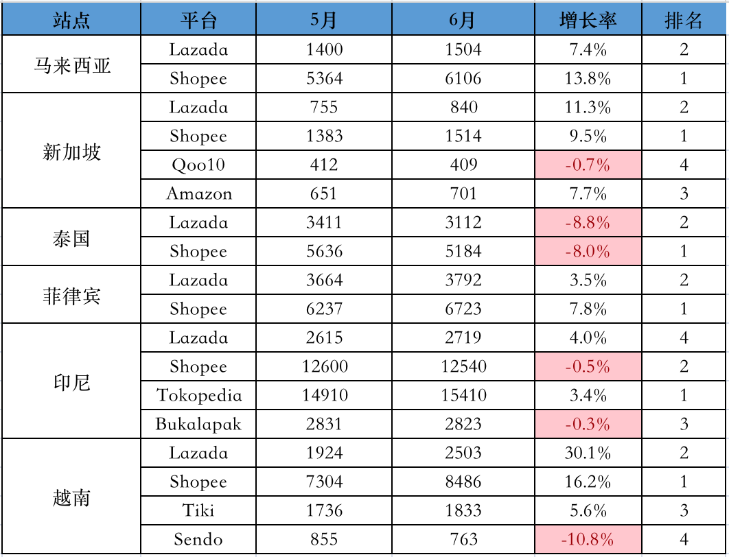 就总量来看,6月份Lazada/Shopee各站点(马来西亚、新加坡、菲律宾、泰国、印尼、越南)网站总流量为5.502亿,较上月增长5.22%;
