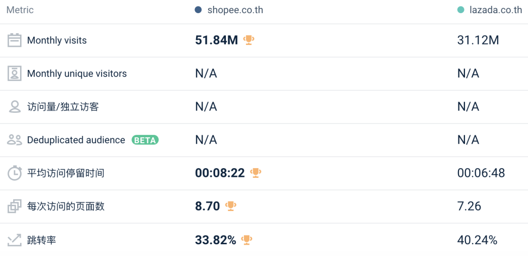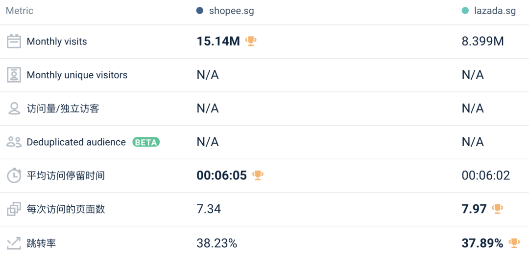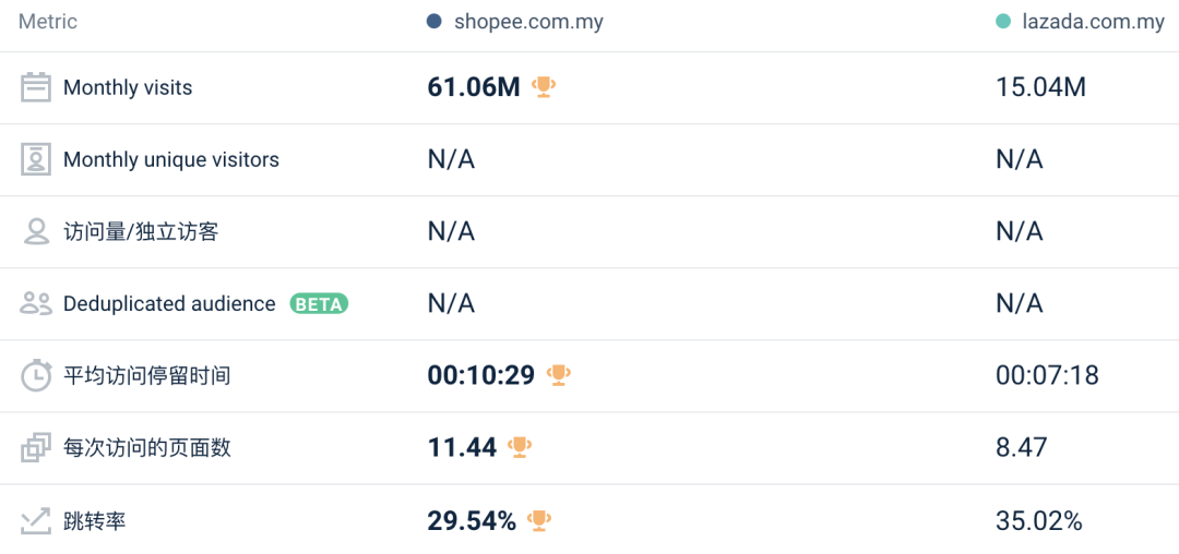 其中Lazada各站点网站总流量为1.447亿,较上月增长5.09%;Shopee各站点网站总流量为4.055亿,较上月增长5.27%。