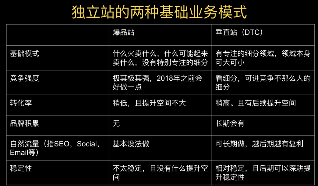 垂直站和爆品站的对比可能有的朋友对独立站,垂直站,爆品站不是那么了解,我这边先解释下。独立站(B2C)常规有两种业务模式,一种是爆品站,就是什么火卖什么,什么可能起来卖什么,没有专注的细分。之前中国确实有一波大卖是靠这个模式起来的,并且做得很大的。一种是垂直站,就是有专注的细分领域,一个站主要卖一个细分垂直领域的产品。垂直站做到极度垂直就是单品站,垂直站做到比较好的程度就是DTC。我觉得DTC没啥特别高大上的,就是做的比较好的垂直站,当然到DTC这个程度了,除了线上也会考虑线下的流量渠道。这两者的主要区别我直接列了一个表在下面,详细解释也写在下面了。