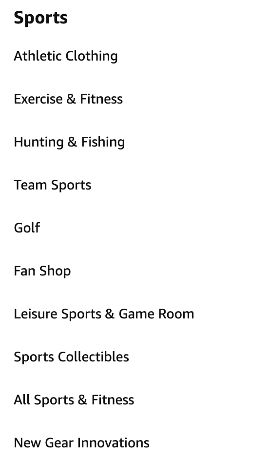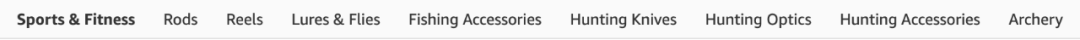 要想对这个有最直观的感受,直接去亚马逊上看可能比较容易理解。比如在亚马逊上,运动(Sports)可以算是一个产业了,然后你去点击Sports的话可以看到下面又可以细分成各种大的相关品类(团体运动,打猎&钓鱼等等如下图)。