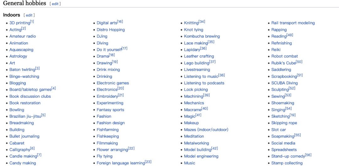 你还可以直接去维基百科的兴趣爱好列表,去看有没有什么兴趣爱好或者是细分的兴趣爱好是你觉得想做的,维基的这份列表里各种各样的爱好都有,我就不全部截出来了。网址:https://en.wikipedia.org/wiki/List_of_hobbies<4> 线下调研或结合自己优势资源