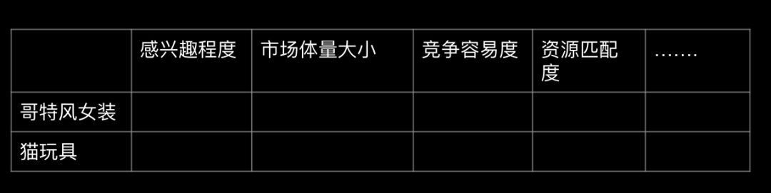 第三步:对比和决定。把最终验证出来可能有潜力的垂直细分领域都列出来,做一个各方面的对比,然后做最后的决定,下面一个步骤一个步骤得讲。
