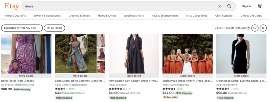 https://www.etsy.com/上面以卖手工艺品出名,也有很多比较有特色的偏小众一些的卖家在里面。可以进入之后用搜索功能,搜和你做的品类相关的关键词,就可以看到很多相关的产品,比如我输入dress【2】社交媒体大号