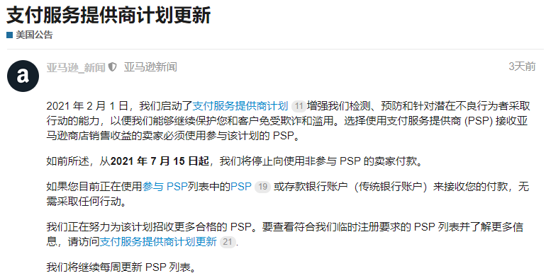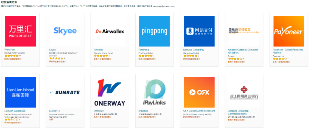 亚马逊还表示正在努力争取让更多合格的支付服务商加入该计划,每周都会更新PSP名单。卖家们需选择以下支付服务商才算合规。