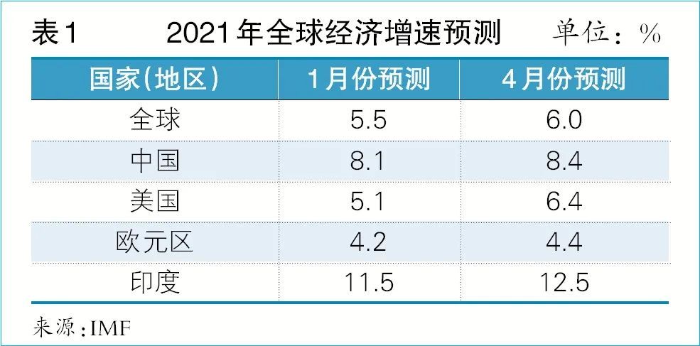 根据国际货币基金组织(IMF)4月份发布的《世界经济展望》,2021年全球GDP增速将达到6%,比1月的预测值上调0.5个百分点。其中,欧元区经济体经济增速预计达4.4%,较其1月的预测值上调0.2个百分点;美国经济增速预计达6.4%,较其1月的预测值上调1.3个百分点。各主要经济体经济均为正增长且涨幅扩大(见表1)。