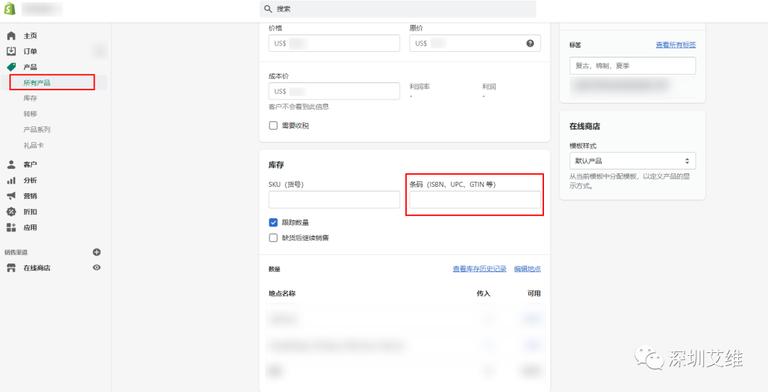 首先进到Shopify后台,选择【产品】-【所有产品】,在页面相应的条码栏目填写,