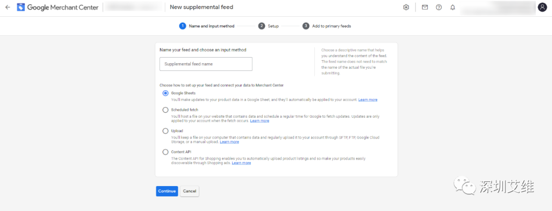 切换到GMC后台 - Products - Feed - Supplemental feeds -Add Supplemental feeds