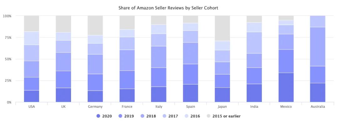 在亚马逊美国、英国、德国和日本这四个最大的市场中,超过一半的销量来自于 2017 年或更早加入的卖家。虽然持续涌入的新卖家带来了增量增长,却不一定能取代过去的卖家。早进场的卖家流失率可控且寿命长,这无疑增加了新卖家的竞争压力,毕竟在选品、优化产品 listing,消费者口碑等方面,早进场的卖家积累了更多经验和实力。
