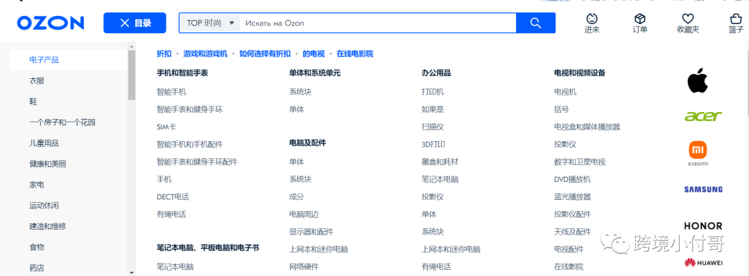 目前在OZON平台卖得最好的,是3C电子类产品,包括手机、耳机。我们也可以通过平台前台的目录可以看到,其他电商平台目录前面基本上是一些服装类,美妆类,电器类等,OZON平台将电子类商品放到目录最前面的位置,事实也证明3C电子类产品也是OZON平台卖的最好的。