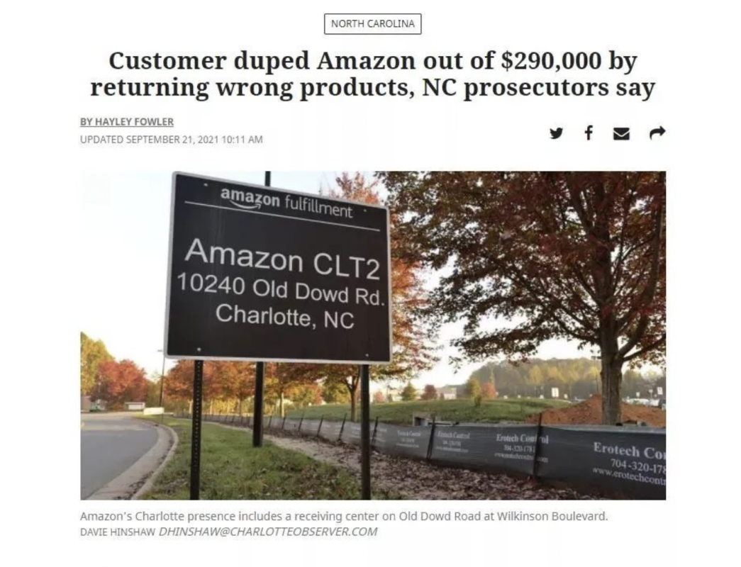 近期,就有一名来自美国北卡罗来纳州夏洛特市的男子,利用亚马逊退款系统的漏洞在平台上骗取了价值超29万美元的商品。据悉,该男子从亚马逊上订购像咖啡机以及笔记本电脑这样的昂贵产品,提交退货并通过退回比订单商品更便宜的类似物品获得亚马逊的全额退款。除了发起退货之外,该男子还会以"未收到商品"或"商品已损坏"为由让卖家更换或补发商品。